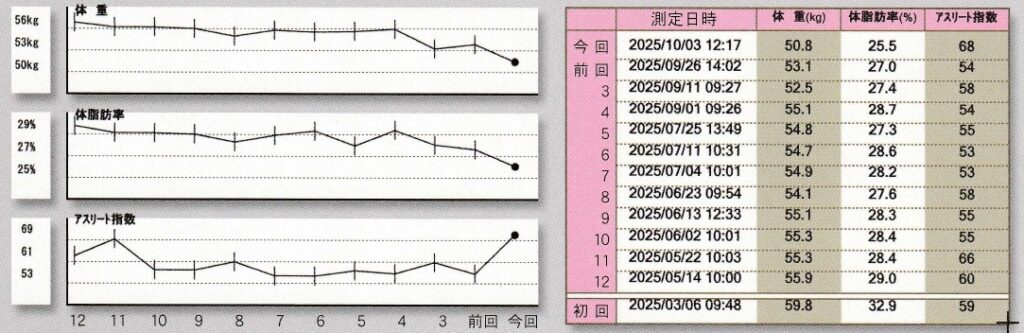 なんと、最後の1週間(9/26→10/3)、ずーっと落ちなかったのが、-2.3kgもスルッと落ちたのです!